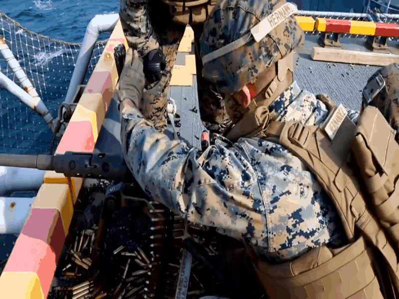 美海军陆战队员使用12.7毫米M2重机枪海上打靶动态图。