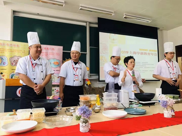 图说:2019年学前教育年会上,曾云皓和“小姜叔叔膳食工坊”的大厨们一起开设的婴幼儿膳食工作坊