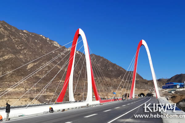 京冀两地携手办奥运,延崇高速千里一线牵。杏林堡大桥采用钢独塔钢主梁双索面斜拉桥,桥上的两座桥塔颜色红白相间,凸显了桥塔的动感,桥塔圆拱形的轮廓又像是一扇门,给往返北京与河北张家口之间的司乘人员一种必经的“冬奥之门”印象。