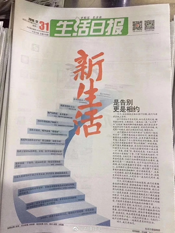 2019年12月31日,《生活日报》在头版刊发了题为“是告别 更是相约”的文章,文章署名“生活日报编辑部”。该文称,“今天,这份报纸定格在第7729期,我们与读者在纸上告别。”