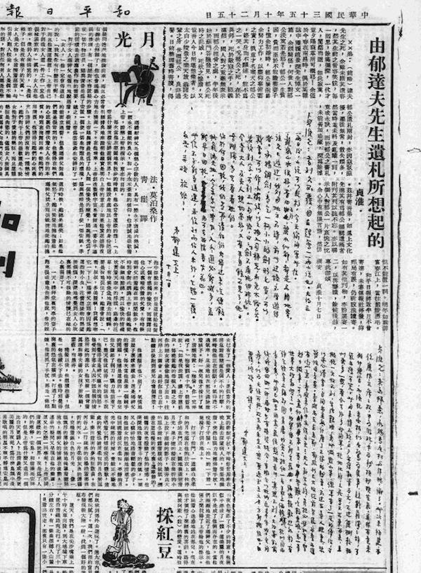 1946年10月25日《和平日报》,贞淮《由郁达夫先生遗札所想起的》