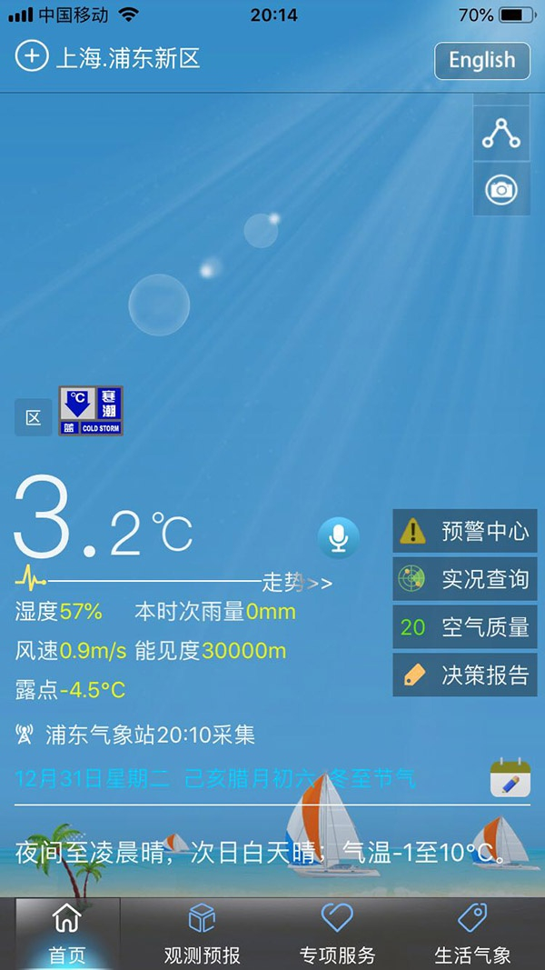 2019年12月31日20时10分,上海浦东新区气温4℃。“上海知天气”APP 截图