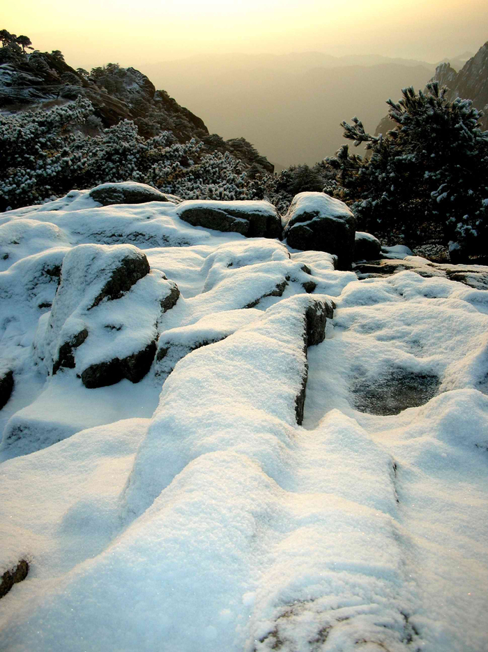 十几年前和朋友去黄山看冬雪,那年元旦正好连着周末,为了节约时间,我们坐周五晚上的火车,从上海出发,硬卧睡了一晚上。上山的时候天还很好,艳阳高照,于是我们计划第二天早上看日出。结果下午竟变成了阴天,准备下山的时候,忽然飘起了雪花。那是我第一次目睹山顶积雪有多快,所谓“雪落高山,霜打平地”。五分钟之内,身边的各种“奇石”都变白了。再过一小会,所有的树都白了,雾凇和冰挂也出现了,最多一个小时,周围由深色变纯白。山路结冰不好走,我们就又在山顶住了一晚,第三天看了雪中日出,下山的时候,发现山腰以下完全没雪。后来去加拿大瑞士看雪,雪是很厚,但天地“变脸”之快,唯有黄山那次。
