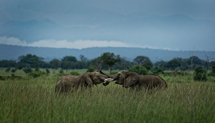 坦桑尼亚米库米国家公园,两只年轻的大象在玩耍。 资料图