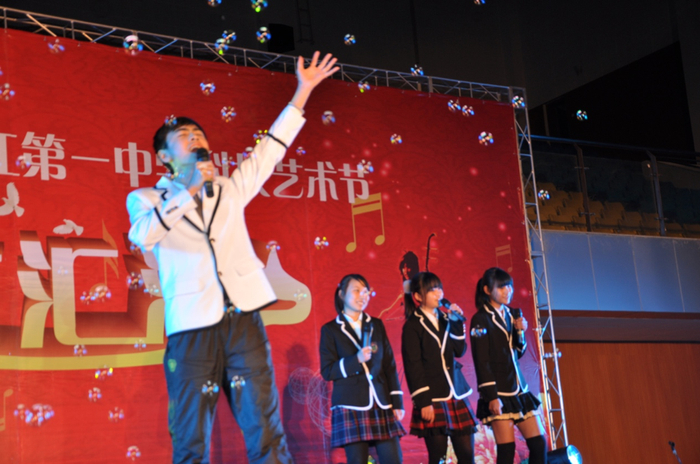 2011年12月跨年的文艺晚会,某班级的男生表演十分投入 王安迪 图