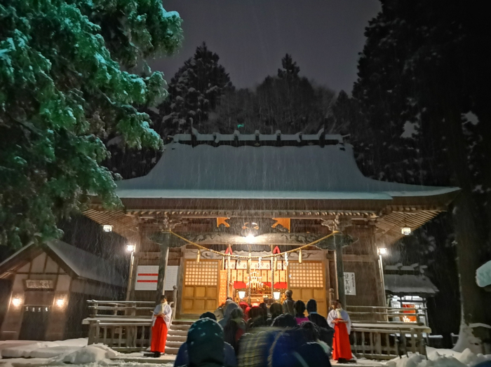 接近午夜零点的时候,我们决定一起去当地的一座神社瞧瞧,因为来之前我们听说这里的神社在新年夜会有祈福活动。于是我们两个就冒着深夜漫天的大雪,缓缓步行前往神社。起初路上见不到什么人,以至于我们甚至以为搞错了。直到离神社越来越近时,就看到三三两两的人从小镇的不同的地方向着神社的方向聚拢过来。