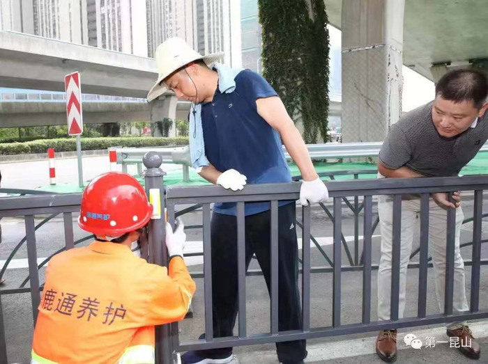 时任昆山市委书记杜小刚利用双休日时间与工人一起安装隔离栏,他推崇城市的精细化管理