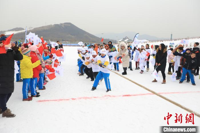 在易县狼牙山滑雪场,小学生进行拔河比赛。 ?赵小松 摄