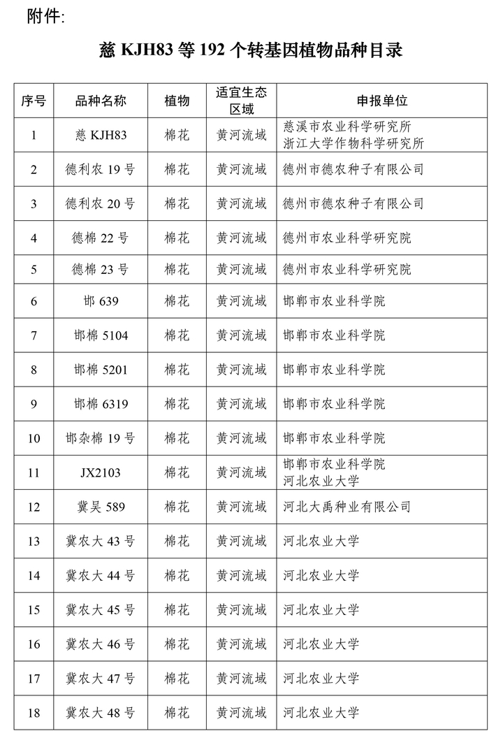 农业农村部科教司当日在官方网站公示了192个拟颁发“农业转基因生物安全证书”植物品种,其中包括189个棉花品种、2个玉米品种和1个大豆品种。公示期为15个工作日,至2020年1月20日截止,如无异议,上述品种将获得生物安全证书。