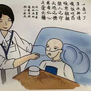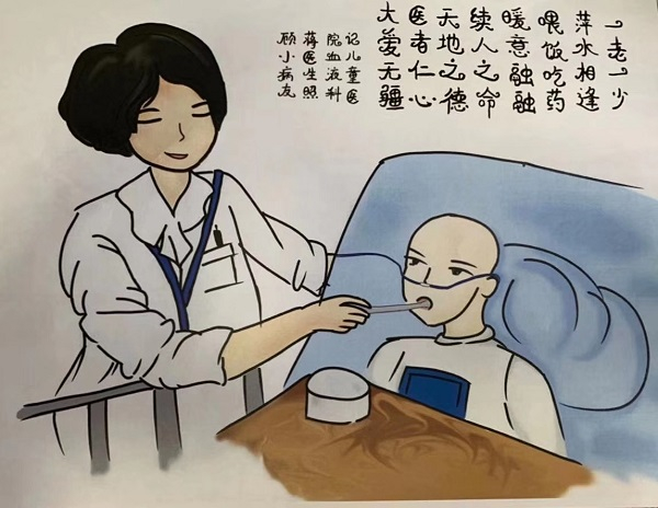 Yuki和穆修都是十二三岁的姑娘,却不幸患上白血病。两位小病友有着同样的爱好:看书,画画。她们在这个冬天互相打气,对抗病魔。穆修是浙江人,去年突然患病,当地医生几次开出病危通知书。她刚来上海市儿童医院时情况很不好,在医护人员和妈妈的悉心照料下,奇迹般地挺了过来,不久前刚出院回家。临走前,她跟Yuki分享了一个故事,那天自己精神很不好,蒋医生来查房,还给她喂饭喂药。Yuki以此为题材创作了一幅画,配文“一老一少,萍水相逢,喂饭吃药,其乐融融;续人之命,天地之德,医者仁心,大爱无疆!”“这两个孩子生病不幸,但她们都那么懂事、那么优秀,希望她们早日康复,重回校园!”蒋慧说。