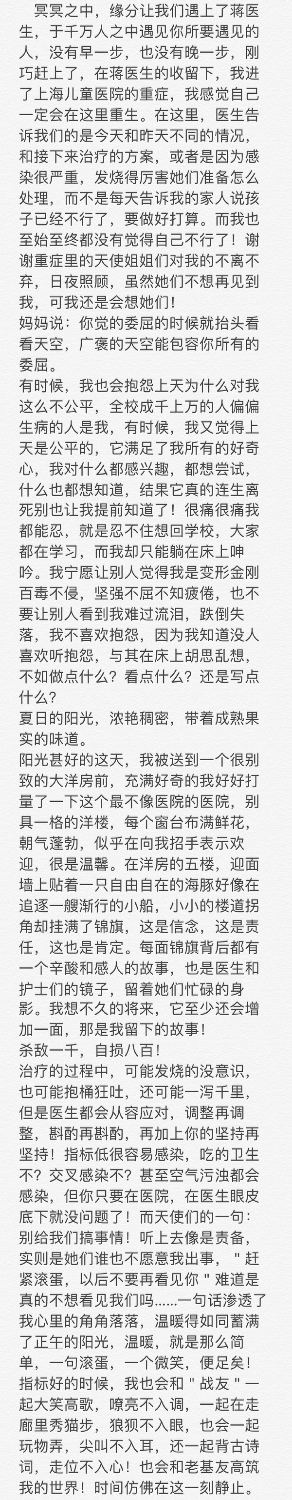 “曾经好几次觉得自己就要倒下的时候,还是过来了。蒋医生说,‘放心吧!没事的!’这句金牌名言,让我一直坚持信念。我想,我一定会攒上足够的运气,走完这条不平常的路!”