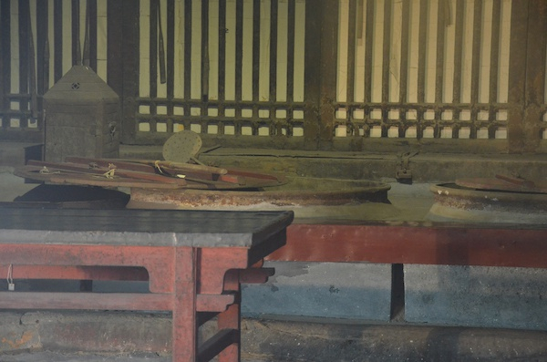 ,东墙上还有灶神牌位,灶间前设置有锡面的杀猪案桌,案前还有两只锡里木槽