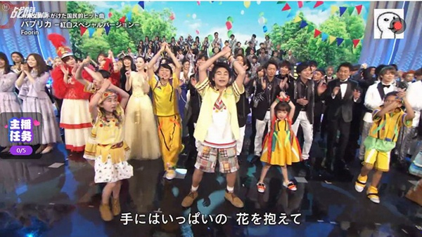 当然,“红白”的具体形式还是跟中国的春节联欢晚会大不一样。不像舞蹈和相声、小品向来在春节晚会上占据着重要地位,“红白歌合战”,就像其名字显露的一样,就是以纯粹的歌唱节目为主,其表演者既有日本传统的“演歌”歌手,也有当年的人气音乐人。由女性歌手组成的“红组”和男性歌手组成的“白组”轮流上场表演、一较高下。在2019年的最后一天,红遍日本的儿童组合“红辣椒(Foorin)”就携其在前一天刚刚获得“2019日本唱片大奖”的一曲《パプリカ(2020东京奥运会应援曲)》揭开了“令和”第一届“红白”的序幕。