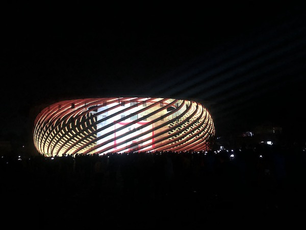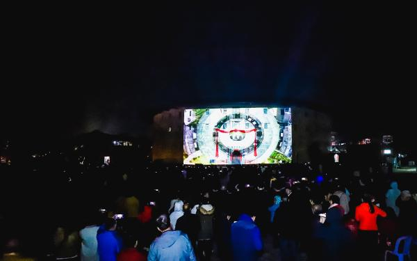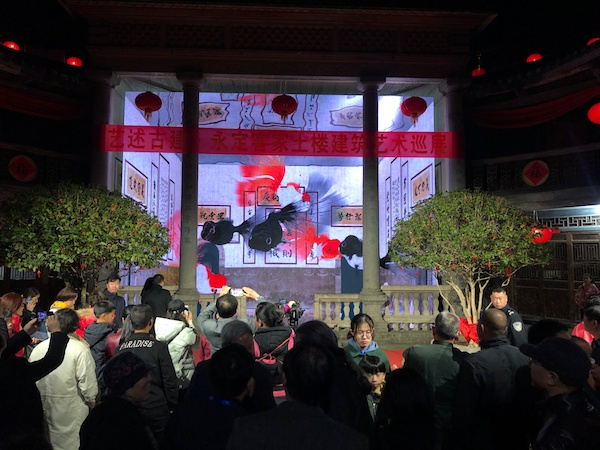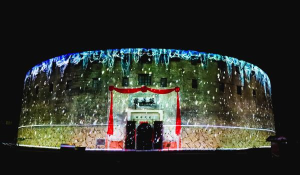 “寻找记忆中的故乡——土楼国际艺术巡展”开幕式上,艺术家以永定振成土楼外立面作为大屏幕,将巨型灯光秀投映在巍然而立的墙面之上,或万马奔腾,或巨龙盘旋,或春光明媚,或雪花飘扬……或呈现土楼在历史典故与民俗风光,变幻莫测的新媒体灯光艺术秀让专程赶来的游客与四乡八邻的乡亲们惊叹不已。