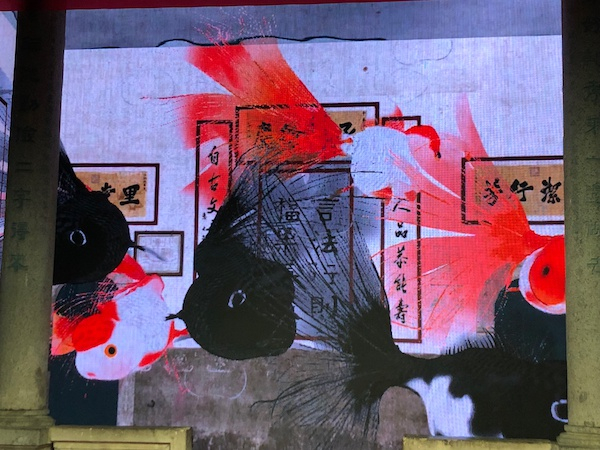有意思的是,这些鱼通过智能设计,随着人声的大小与掌声,即面向观众游来,而当没有声音时,金鱼则游入远方直至消逝。