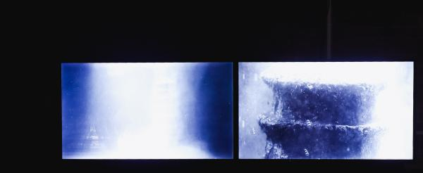 在中国当代装置艺术中,管怀宾擅于将传统文化和感知方式解构并溶入到自身的语言系统与作品构架中,将中国古典造园美学融入其空间装置形态。此次管怀宾的影像作品名为《流隙》,管怀宾说:“流隙是物质的侵蚀和流变;是岁月对于历史与记忆的打磨过滤;是无数的精彩时刻被挤压消耗的瞬间。十年前我在苏州齐门拍摄到一幕难忘的景观:那是荒凉废墟中孤寂于烟云间的北寺塔,就像一幕凝固的历史舞台。这静观实态的图片,后来被我用在当年上海双年展的装置作品之中。《流隙》的拍摄与这两段经由的线索相关,当然也是对中国快速的城市化进程所引发许多历史与文化记忆渐行渐远的感怀。这部9分25秒的影像,记录一座由陶土砂浆铸造的塔在水下不断侵蚀坍塌的过程。虽然图像与画面有着物理般的界面和诗意的视觉,但其泛浮的水泡与坠落的流砂其实穿梭刺痛在我的身体与所有末梢感知之中。”