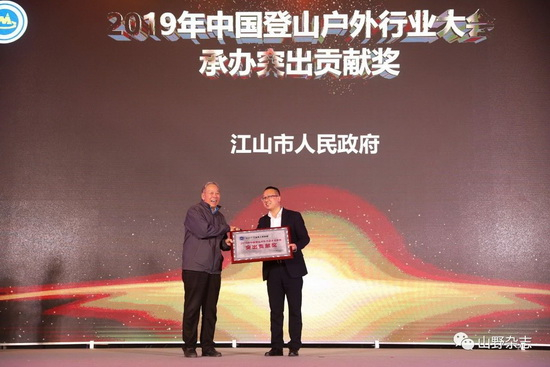 同时,向9家中国登山协会官方赞助商颁发年度特别贡献奖,7家2019年中国登山协会行业大会赞助商和获得大会承办突出贡献奖的江山市人民政府获得表彰。