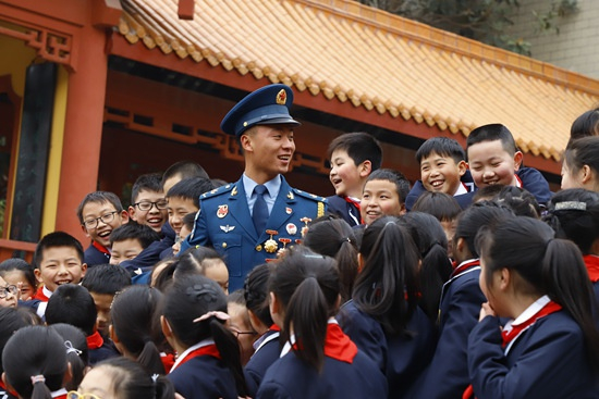 在四川中江黄继光纪念馆内,程强与继光中学的同学们分享个人成长经历。