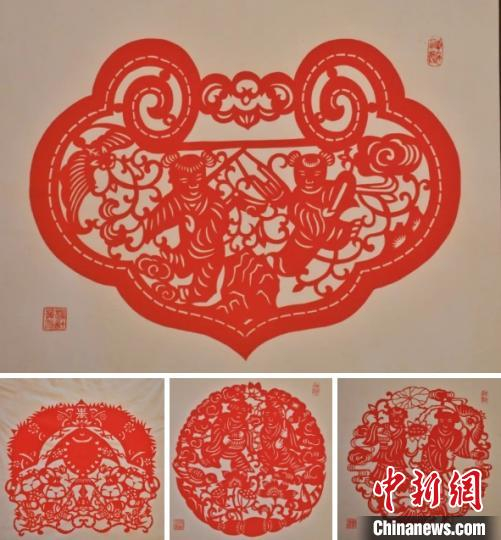 记者看到了其中一张和合文化剪纸作品,如意形状的画面中,和合二仙坐于正中,周围以如意、蝙蝠、铜钱、喜鹊、祥云为点缀,底部是荷花、莲子等喜庆元素。