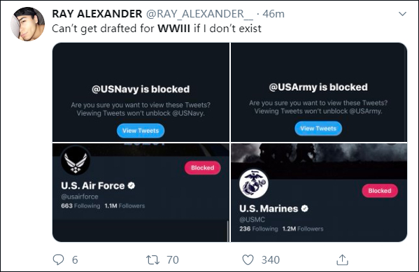 也有自欺欺人型的:在推特屏蔽美国军队账号,假装自己不存在,“别把我扯进去,我不存在”。