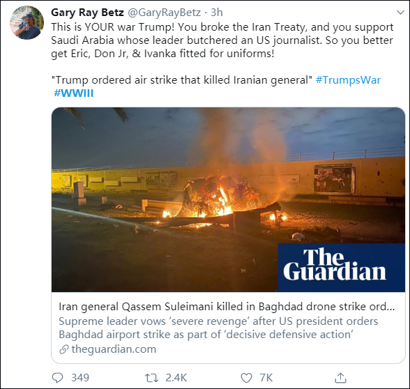 “特朗普,这是你一个人的战争!是你退出了伊朗核协议,是你支持虐杀记者的沙特。所以你最好送自己的孩子上战场!”;