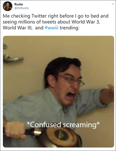 “我入睡前刷一下推特,却发现第三次世界大战上了热搜:(困惑地尖叫)”