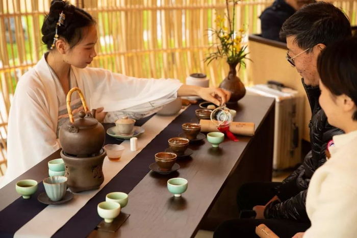 唐代煎茶法和唐制插花,亦首次实地呈现。一炉一火,一人一桌,袅袅茶香荡漾,配合身着宽袍长袖唐衣的工作人员、零距离的盛唐衣展与试穿体验,把宾客带回到长安街巷,一窥彼时唐人生活雅境。