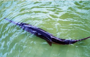 白鲟腹部黑白色头部灰色,吻长达到身体的一半,又称“象鱼”,是世界上最大的淡水鱼之一,身长可达7 米,体重可达700 多公斤,主食鱼类、虾、蟹等,其寿命一般在30年左右。