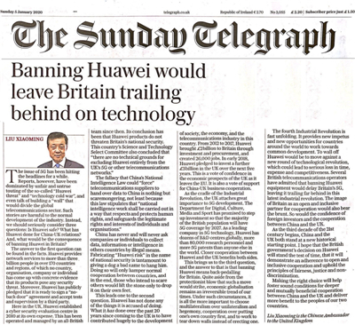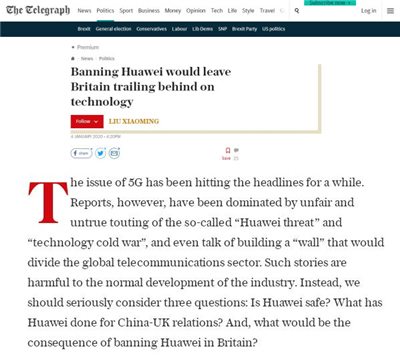 (观察者网讯)据中国驻英国大使馆网站1月6日消息,2020年1月5日,英国主流大报《星期日电讯报》以《禁止华为将使英国在新一轮技术革命中落后》为题,在纸质版和网络版发表刘晓明大使署名文章。全文如下: