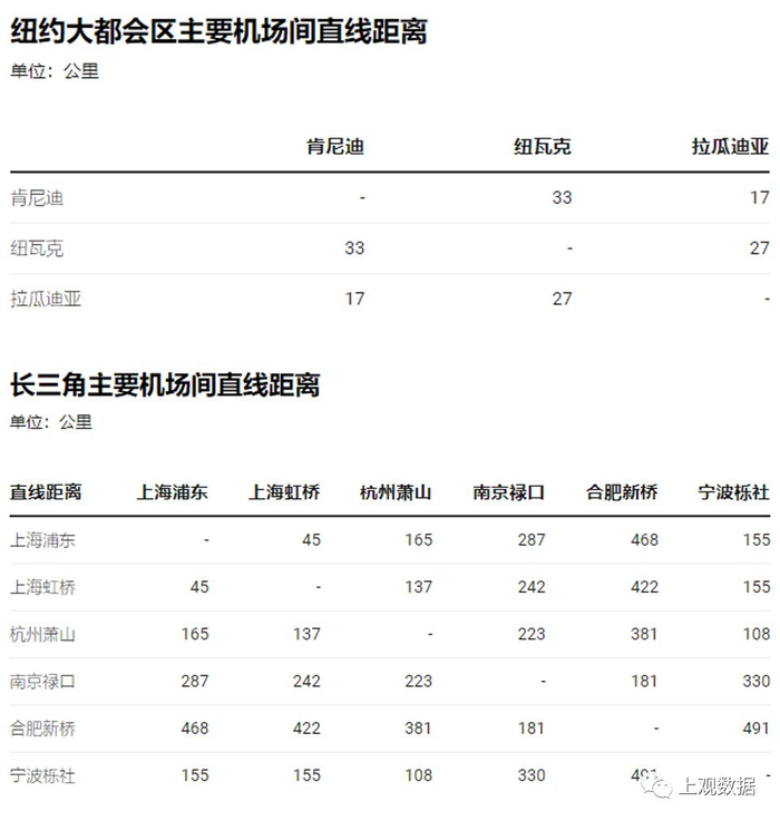 总的来说,这三个机场在需求旺盛的市场充分竞争,但同时保持各自的重点市场与独立运营的差异化,这是上海及周边机场群目前相对所欠缺的。尤其值得注意的是,纽约大都会区的三个机场,距离都相当近,基本都在30公里以内。而上海浦东和虹桥相距45公里,周边其他机场距离浦东或虹桥,都在100公里以外,这也导致了机场之间的交通很不方便,在转运旅客时无法协同运营。