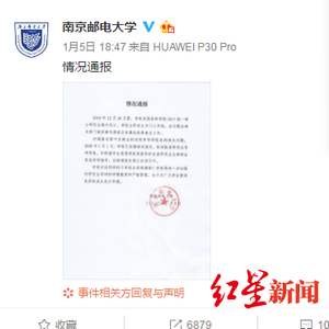 南京邮电大学1月5日发布情况通报:2019年12月26日晨,学校发现材料学院2017级一硕士研究生意外死亡。学校立即成立专门工作组,全力配合相关部门做好事件调查及家属安抚等善后工作。