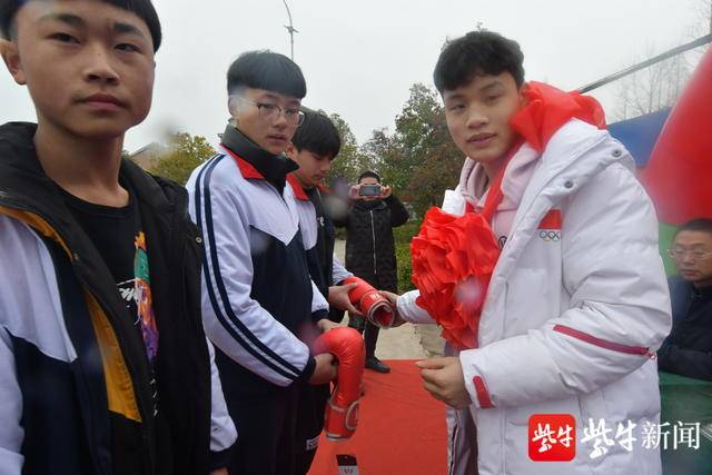 周旭回母校为学弟们送上拳套。