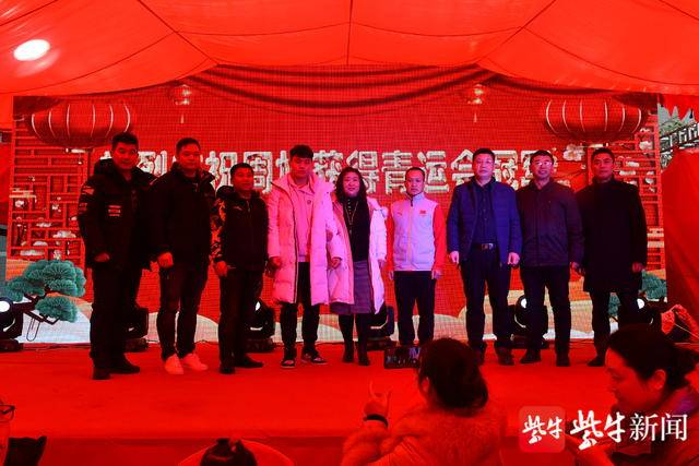 周旭一家三口与教练、乡邻合影留念。
