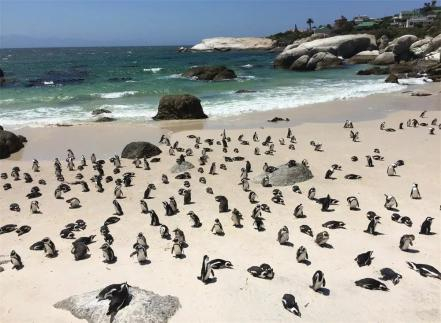 在西蒙镇的沙滩礁石之间,生活着上千只南非企鹅。南非企鹅的体态娇小,腹白背黑,看起来就像披了一件燕尾服,眼睛上方有一抹红色,仿佛画了眼影。它们在中午的阳光下趴在沙滩和礁石之上懒洋洋地晒着太阳。海浪不停地冲向沙滩,被海浪打湿的企鹅会连忙站起来,再缓缓向前移动到干燥温暖的沙地,然后再次趴下,憨态可掬。