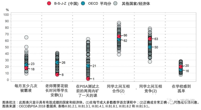 有66%的中国学生表示他们的同学在学习中会相互合作(OECD平均为62%),而有63%的学生表示他们会彼此竞争(OECD平均为50%)。但中国学生感到孤独的更多,约有20%(OECD平均为16%)。
