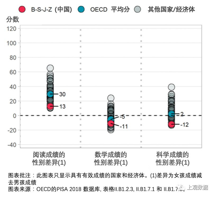 阅读上,参与测试的国家都是女生成绩更好。中国女生的成绩比男生高13分,而OECD国家的女孩平均要高出30分。