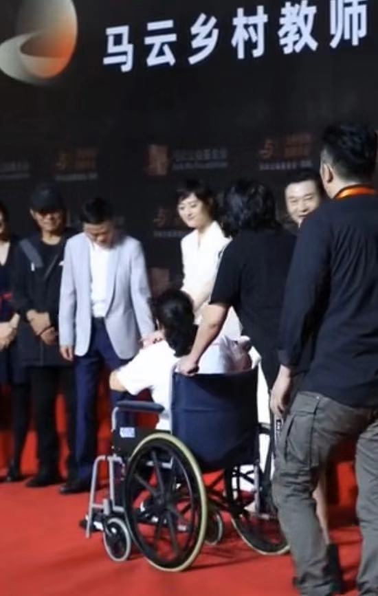 坐在轮椅上的乡村教师彭筱云,是被推着进入红毯的。露出笑容的马云上前弯腰,和她握手、拥抱。