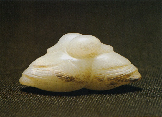 这是一件用来自新疆和田的玉料雕刻而成的鸳鸯饰件,两只鸳鸯双翅并拢,短尾下垂,交颈而卧,颈部有穿孔,丰满的身躯透露着舒适和悠然,压低了的双颈和下垂的眼帘,刻画着这对“匹鸟”的两情缱绻。它出土于内蒙古自治区哲里木盟(现通辽市)奈曼旗青龙镇东北的一座辽代墓葬中,考古报告称之为“辽陈国公主墓”,实际上是陈国公主和驸马萧绍矩的合葬墓。