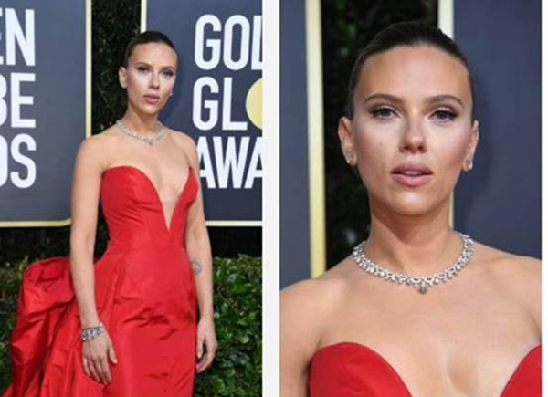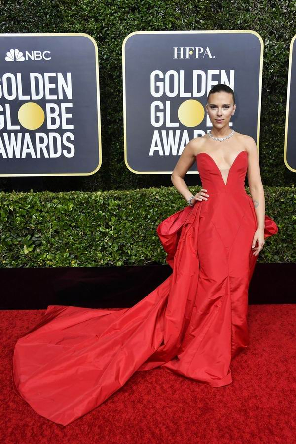 Scarlett Johansson身着Vera Wang 定制款Scarlet礼服裙、佩戴Bvlgari高级珠宝亮相第77届金球奖红毯。