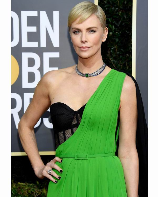 “女魔头”Charlize Theron依旧是招牌短发,一身Dior Couture 斜肩礼服霸气现身红毯,果绿色和黑色的拼接裙装别致有趣。和她在提名影片《爆炸新闻》中的职场女性角色,一样干练有气场。相当吸睛的礼服颜色,应该是她的红毯“小心机”吧!
