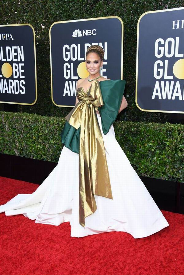 “拉丁天后”Jennifer Lopez的好身材依旧是吃了防腐剂一样。她今年凭借电影《舞女大盗》在镜头前大秀了一段钢管舞,身材热辣令人难以相信她已经是50岁的女明星。此次金球奖的红毯造型整体统一,金色和绿色交织的华丽礼服让好身材展露无遗。而Harry Winston的祖母绿珠宝顺着她健康的肤色过渡到礼服,相得益彰。