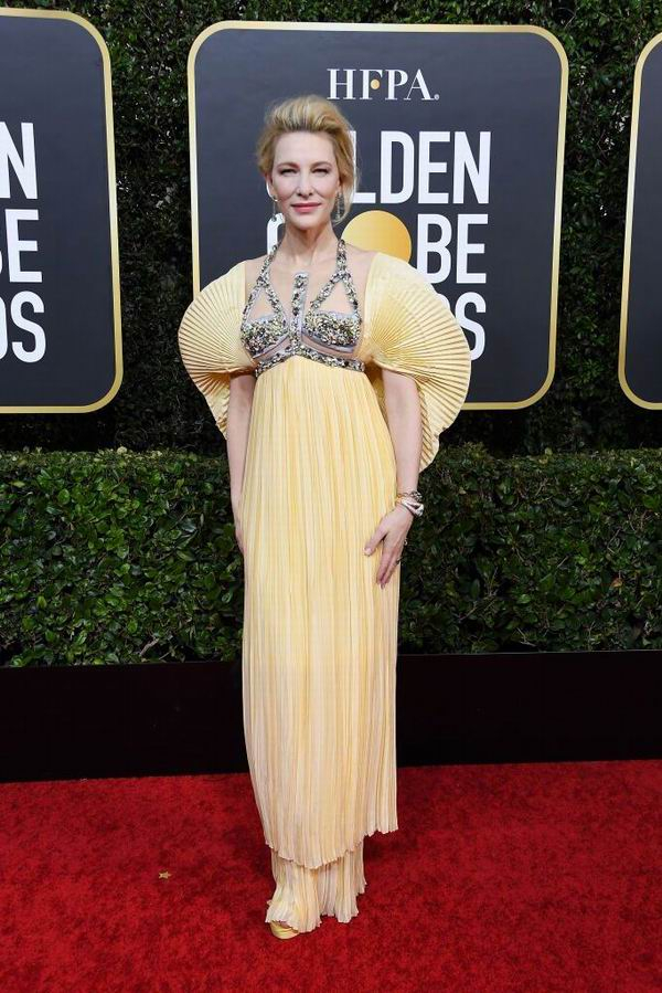 再挑人的礼服,也难不倒Cate Blanchett。这件鹅黄色的礼服来自希腊女设计师同名品牌Mary Katrantzou 2020春夏系列,女王的气质与完美的妆发设计,将这件立体感极强的浅黄色礼服诠释得极致高贵典雅。此次她还选搭了意大利珠宝Pomellato,举手抬足都璀璨逼人。她穿的,就是气场。
