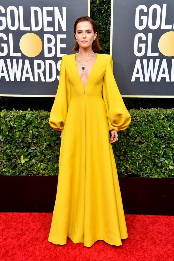 Zoey Deutch 给自己选的这件Fendi高级定制长裙十分惹眼,明黄色的面料看起来欢快活泼,搭配垫肩设计和深V字让整件衣服看起来利落又很有气场,Harry Winston的蓝宝石耳坠和项链与礼服形成撞色对比,简单又好看。