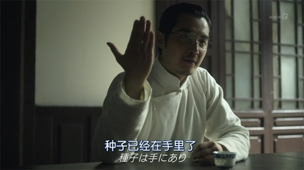 在上海,芥川见了多位当时中国的著名人物,如章太炎、郑孝胥,对这二位,他恭敬,但文中带着讽刺,比如写郑孝胥的“安贫乐道”,观其几进的大宅子和精心打理的院落,他“内涵”人家:这样的安贫乐道他也很愿意过。而对于当时的进步青年、后来的中共一大代表李人杰(李汉俊),他则不吝赞美之词。他对李印象极佳。夸李人杰日语好,甚至好过日本人。李关于时政的看法,被芥川细细记成笔记写入游记。其中一句“现代之中国无民意,无民意则革命不生”,令人印象深刻。这个角色由大家比较熟悉的中国演员金世佳出演。