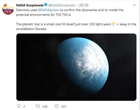 据报道,NASA喷射推进实验室在夏威夷檀香山举行的年度美国天文学会中,宣布了这项好消息。这枚名为TOI 700 d的行星,距离地球相对接近,仅100光年之远。