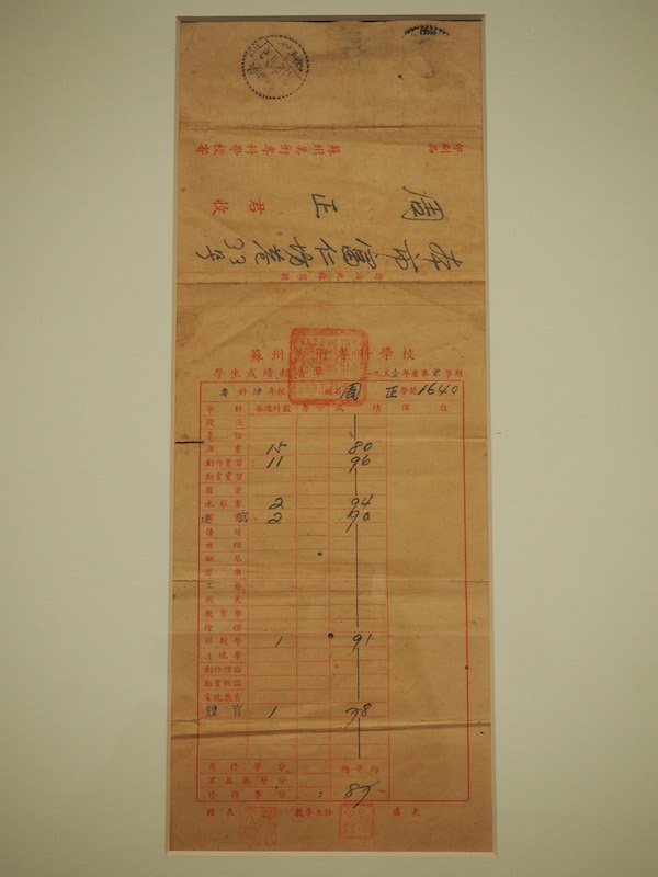 澎湃新闻:展览上,终于看到“苏州美术专科学校学生成绩报告单”,几乎已经没有人保留着这么珍贵的原件,请您谈谈这张成绩单的故事吧。