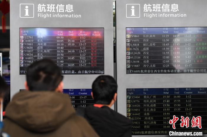 据统计,截至13时,已造成16个出港航班延误,2个航班取消,约2300名旅客出行受到影响。图为旅客查看航班信息。 何蓬磊 摄