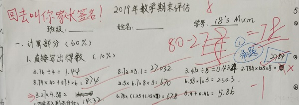 图说:一份五年级孩子出给家长的数学期末考卷 来源/采访对象供图(下同)