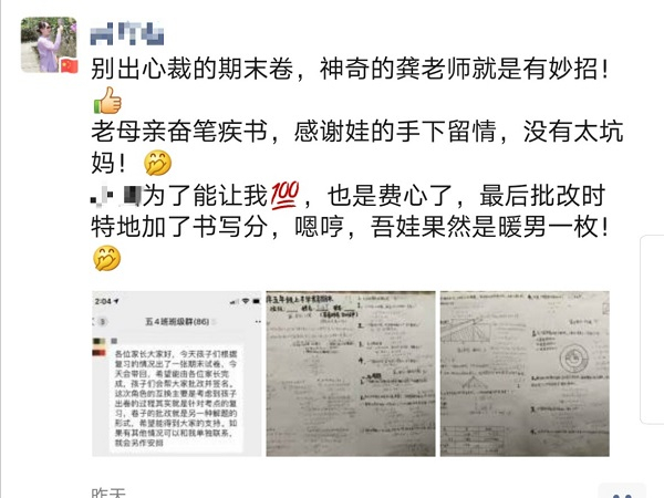 所有答卷中的最低分是50分,由班上“学霸”彤彤的妈妈获得。彤彤妈妈特意私信了龚老师揭秘——为了避免孩子期末考“踩坑”,她特意把孩子有可能“踩坑”的知识点,全部故意错了一遍。