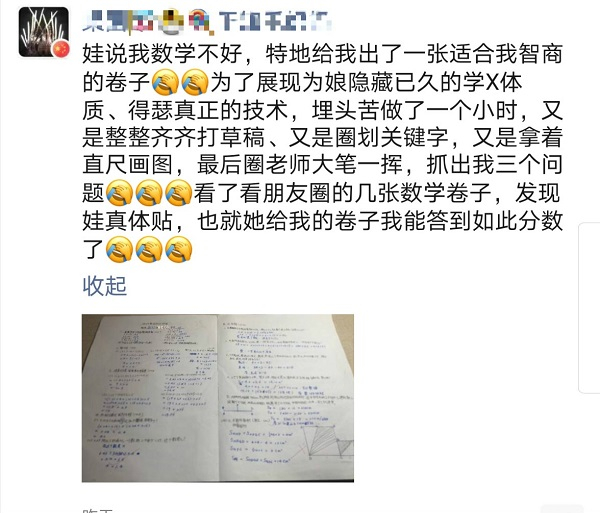 “为了争一口气,给孩子做榜样,很多家长都拼了!”龚老师说,第二天,他的朋友圈几乎被家长们刷屏了。男孩奕孜的爸爸认认真真按照平时对儿子的要求,严格按照答题规范——关键词要圈划,计算草稿要整齐,线段图要清晰标注,不能偷懒……终于,他拿了满分,终于没有辜负奕孜妈妈的期望。也有家长没那么幸运,只能哀叹:“计算怎么错了!单位怎么可以想当然!平时训他的话,如数奉还……”一个孩子的妈妈只考了78分,被要求“回家请家长签名”,没想到,在孩子外公那里也碰了壁,只能哀叹“哎,我怎么对得起高考数学148的自己”。